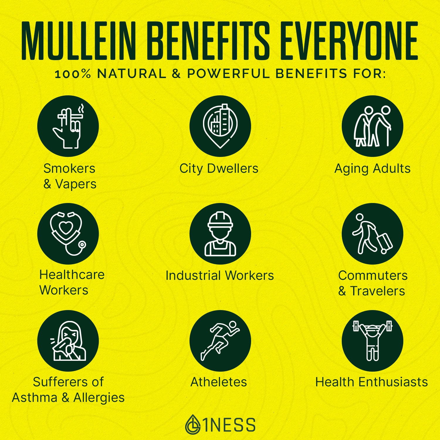 1NESS® Mullein Leaf Extract for Healthy Lungs is carefully crafted in the USA with high-quality, USDA Organic ingredients. This advanced herbal blend supports your respiratory system, helps clear mucus, soothes your throat, and promotes easier breathing, all while boosting immunity and reducing inflammation.